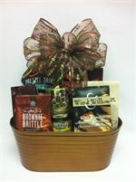 Our Fall Is In The Air Gourmet Gift Basket is filled with a wonderful assortment of savory and sweet gourmet treats sure to please. We include gourmet sweet and savory items that may include: We include a variety of gourmet items that may include: Brownie Brittle, Pretzels, Chocolate covered Espresso Beans, Cheese cake mix, fall themed candle holder with candle, Maple cookies and more. We assemble all the gourmet treats into a beautiful fall tin that can be used as a decor item. This gift basket is cello wrapped and finished with or signature hand tied bow.
